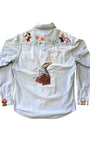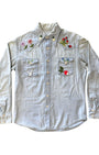 This vintage 1970s chambray shirt is a wearable canvas of delicate embroidery—featuring birds, flowers, mushrooms, strawberries, and one majestic eagle in flight. Softly worn cotton and sun-faded blues give it that lived-in feel only time can produce.