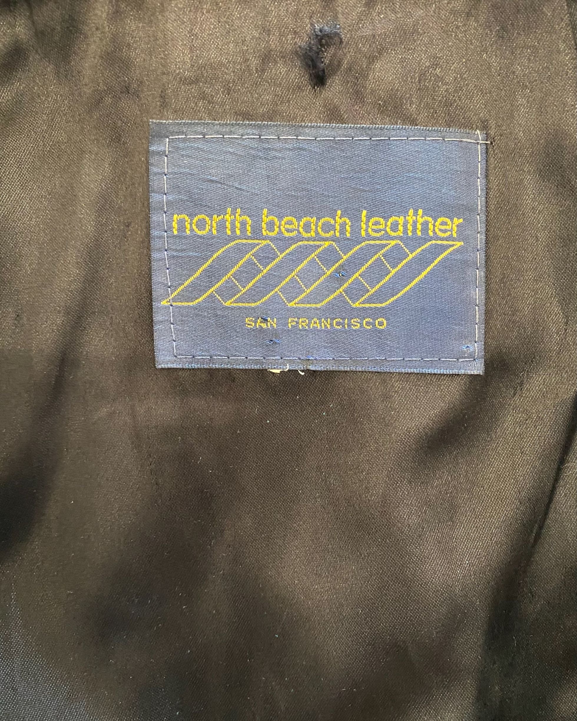 Rendered in a smooth black leather with a slight sheen, it features a clean zip front, sharp point collar, flap-front pockets, ribbed cuffs and waistband, and a cropped bomber silhouette that feels as relevant now as it did back then. The label proudly reads North Beach Leather, San Francisco—a name that stood at the intersection of fashion, funk, and freedom.