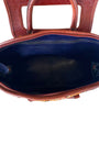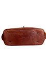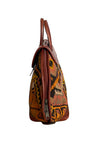 Roomy enough for weekend getaways yet stylish enough for everyday use, this bag features a wide zippered opening, a spacious interior lined with deep navy fabric, and an inner zip pocket for keeping essentials secure. Its vibrant geometric pattern, classic dome shape, and solid leather base with protective feet ensure it stands out while standing up to travel.