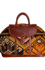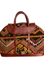 This vintage Kilim carpet bag tote from the 1980s blends timeless craftsmanship with rugged sophistication. Made from handwoven wool Kilim fabric and finished with rich leather handles, a leather flap closure, and sturdy leather trim, it’s built for a lifetime of adventures.