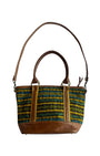 Buckle up, because this bag’s got horsepower. Crafted from original 1970s Chevy Pinto upholstery and trimmed in supple leather, this vintage-meets-modern Kim White creation brings muscle car attitude to your everyday carry. The fabric’s bold yellow, teal, and charcoal stripe pattern reads fast lane fashion, while the structured tote silhouette keeps it chic and city-ready.