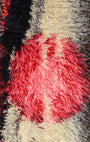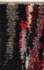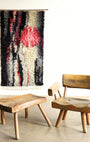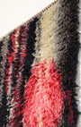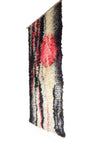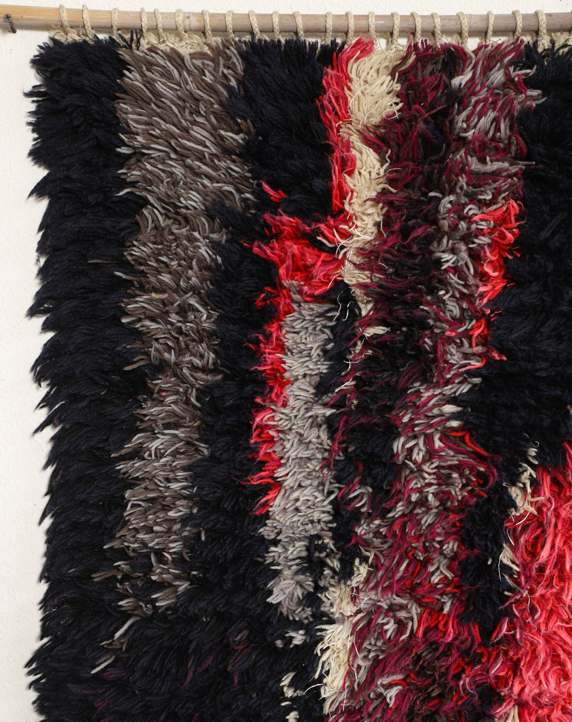 This handwoven rya wall hanging blurs the line between textile and fine art. Crafted in the mid-20th century using high-quality wool, its bold vertical composition features deep blacks, charcoal greys, cream tones, and a striking burst of red at the center. The deep-pile texture and sculptural variation in yarn density create a dimensional surface that changes with the light. Designed for wall display, this piece hangs from a solid rod using built-in 1” loops and is finished with a 3.5” hand-tied fringe along the bottom. A rare find that brings warmth, rhythm, and modernist elegance to any space.