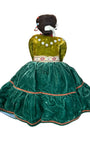 This handcrafted Native American cloth doll from the 1940s is a striking example of folk art and textile craftsmanship. Dressed in rich velvet with layered skirts and petticoats, it showcases intricate beadwork and embroidery reflecting traditional tribal attire. Handcrafted boots and tights add to its detailed artistry, making it both a collectible and a cultural artifact that honors generations of skilled craftsmanship.