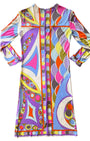 A kaleidoscope of color and iconic design, this vintage Emilio Pucci dress brings pure 1970s magic to life. Created exclusively for Saks Fifth Avenue, it features Pucci's unmistakable swirling patterns in vibrant hues of purple, yellow, orange, pink, and blue. Crafted from a silky jersey fabric with a slight stretch, it’s designed with a classic A-line silhouette, jewel neckline, long sleeves, and a hidden back zipper.