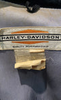 Straight from the open roads of the 1960s, this Harley-Davidson café racer jacket delivers pure vintage attitude. Cut slim with a short stand collar, zippered chest pockets, and zippered cuffs, it was built for speed, rebellion, and the freedom of the ride. The black leather has aged beautifully—creased and softened in all the right places, showing off a patina that only decades of wear can achieve. Inside, the classic olive lining holds strong, complete with Harley’s original “Quality Workmanship” label.